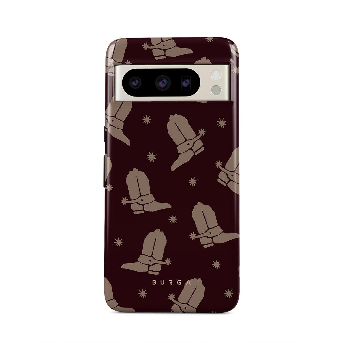Say Howdy to this charming Google Pixel 8 Pro phone case design. Cowboy boots and stars dance across a deep brown background, celebrating the essence of western life. Perfect for those who embrace their free spirit.