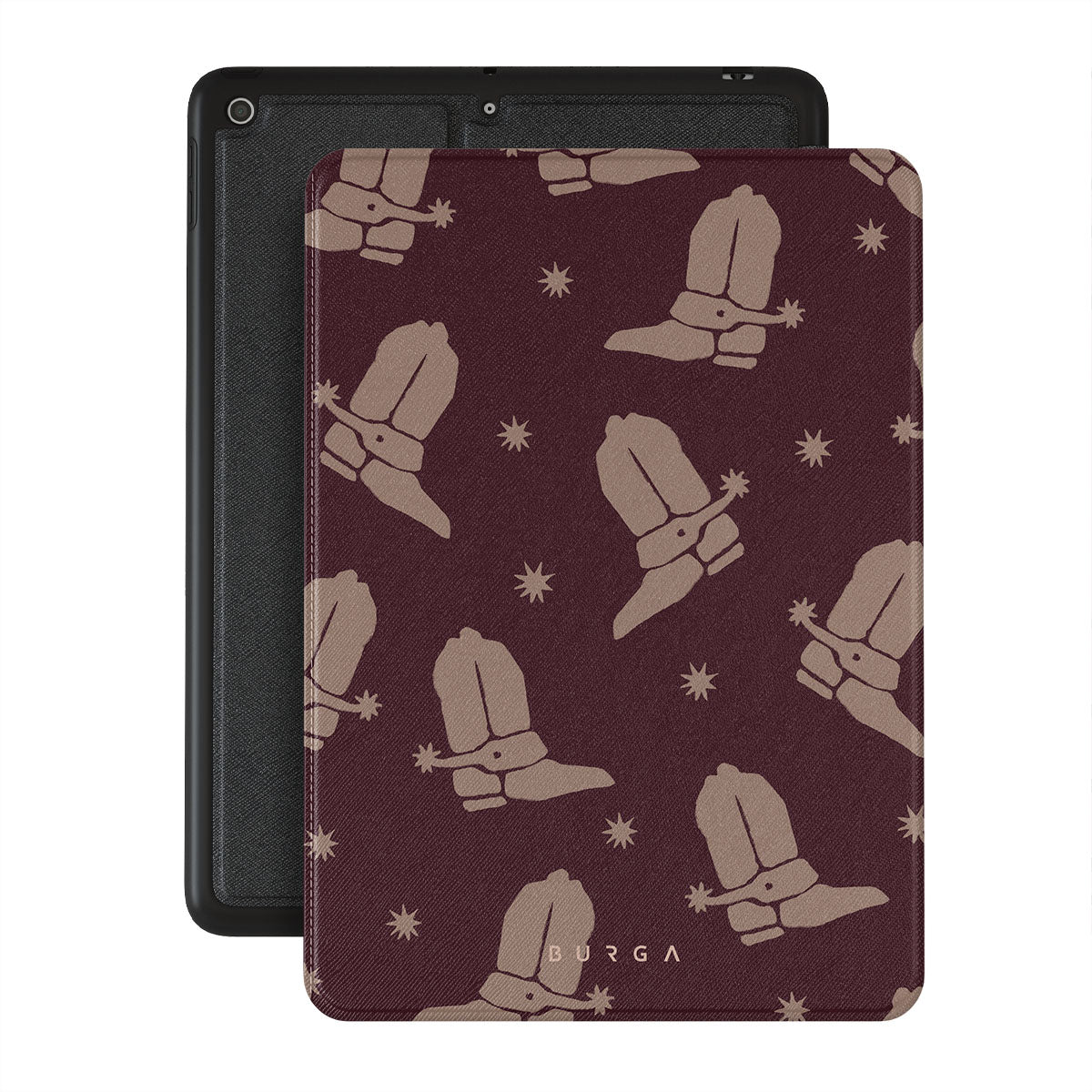 Say Howdy to this charming iPad 10.2 (9th/8th/7th Gen) folio case design. Cowboy boots and stars dance across a deep brown background, celebrating the essence of western life. Perfect for those who embrace their free spirit.