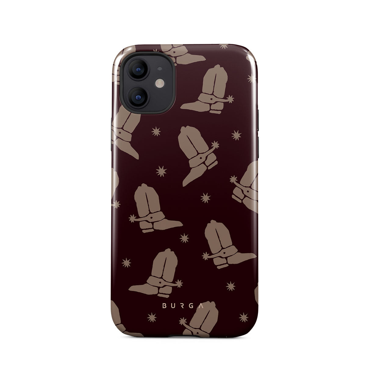Say Howdy to this charming iPhone 12 phone case design. Cowboy boots and stars dance across a deep brown background, celebrating the essence of western life. Perfect for those who embrace their free spirit.