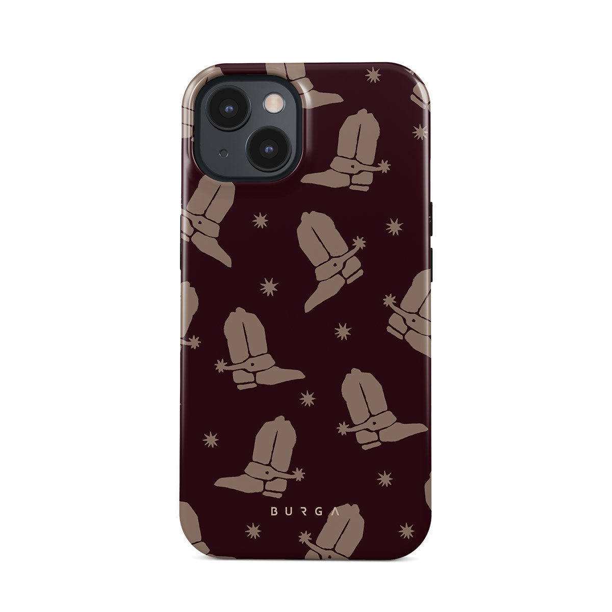 Say Howdy to this charming iPhone 14 Plus phone case design. Cowboy boots and stars dance across a deep brown background, celebrating the essence of western life. Perfect for those who embrace their free spirit.