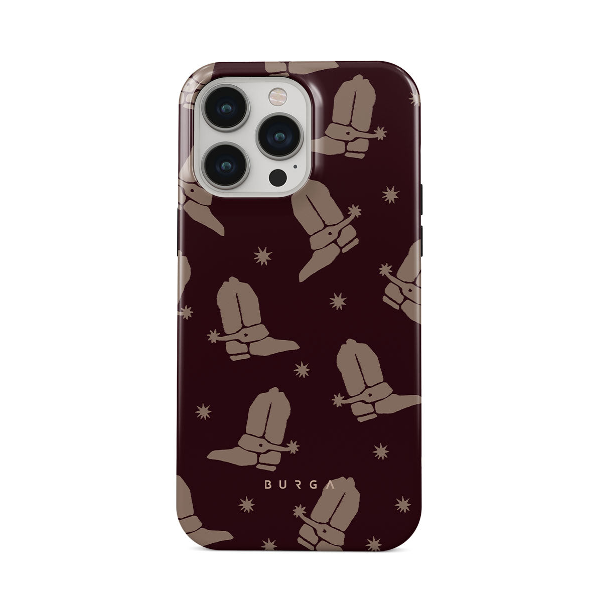 Say Howdy to this charming iPhone 14 Pro Max phone case design. Cowboy boots and stars dance across a deep brown background, celebrating the essence of western life. Perfect for those who embrace their free spirit.