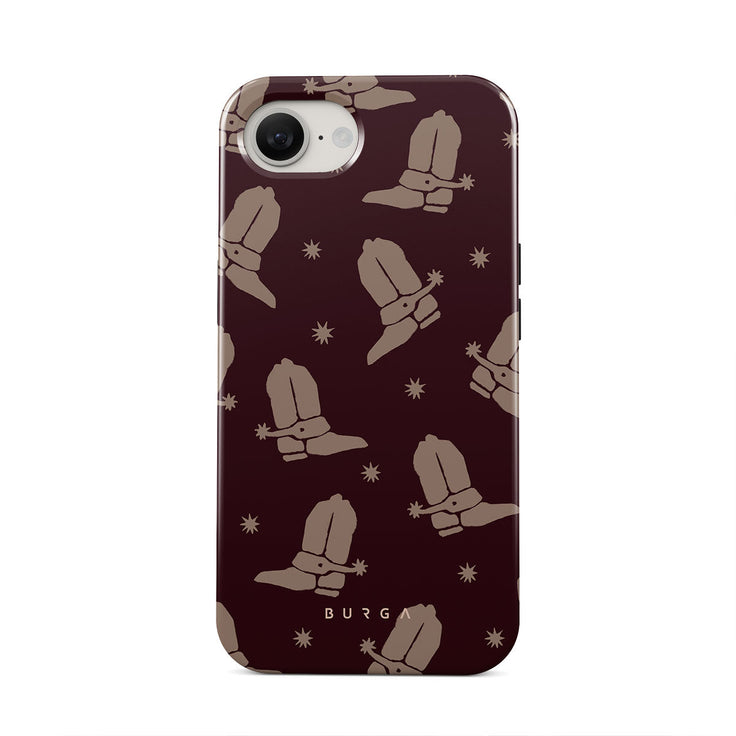 Say Howdy to this charming iPhone 16e phone case design. Cowboy boots and stars dance across a deep brown background, celebrating the essence of western life. Perfect for those who embrace their free spirit.