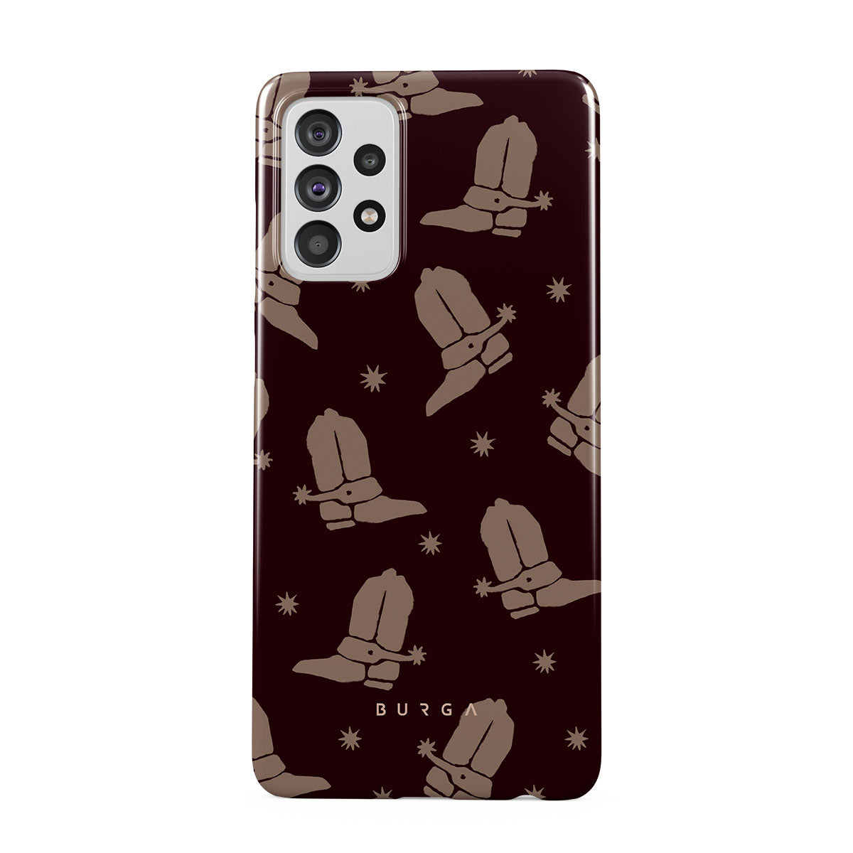 Say Howdy to this charming Samsung Galaxy A72 4G / 5G phone case design. Cowboy boots and stars dance across a deep brown background, celebrating the essence of western life. Perfect for those who embrace their free spirit.