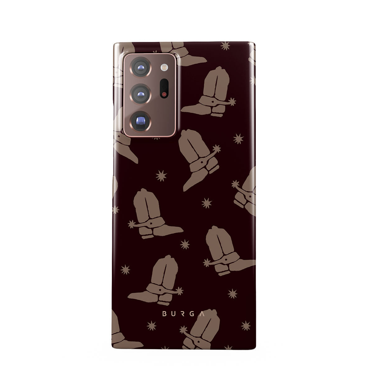 Say Howdy to this charming Samsung Galaxy Note 20 Ultra 4G / 5G phone case design. Cowboy boots and stars dance across a deep brown background, celebrating the essence of western life. Perfect for those who embrace their free spirit.