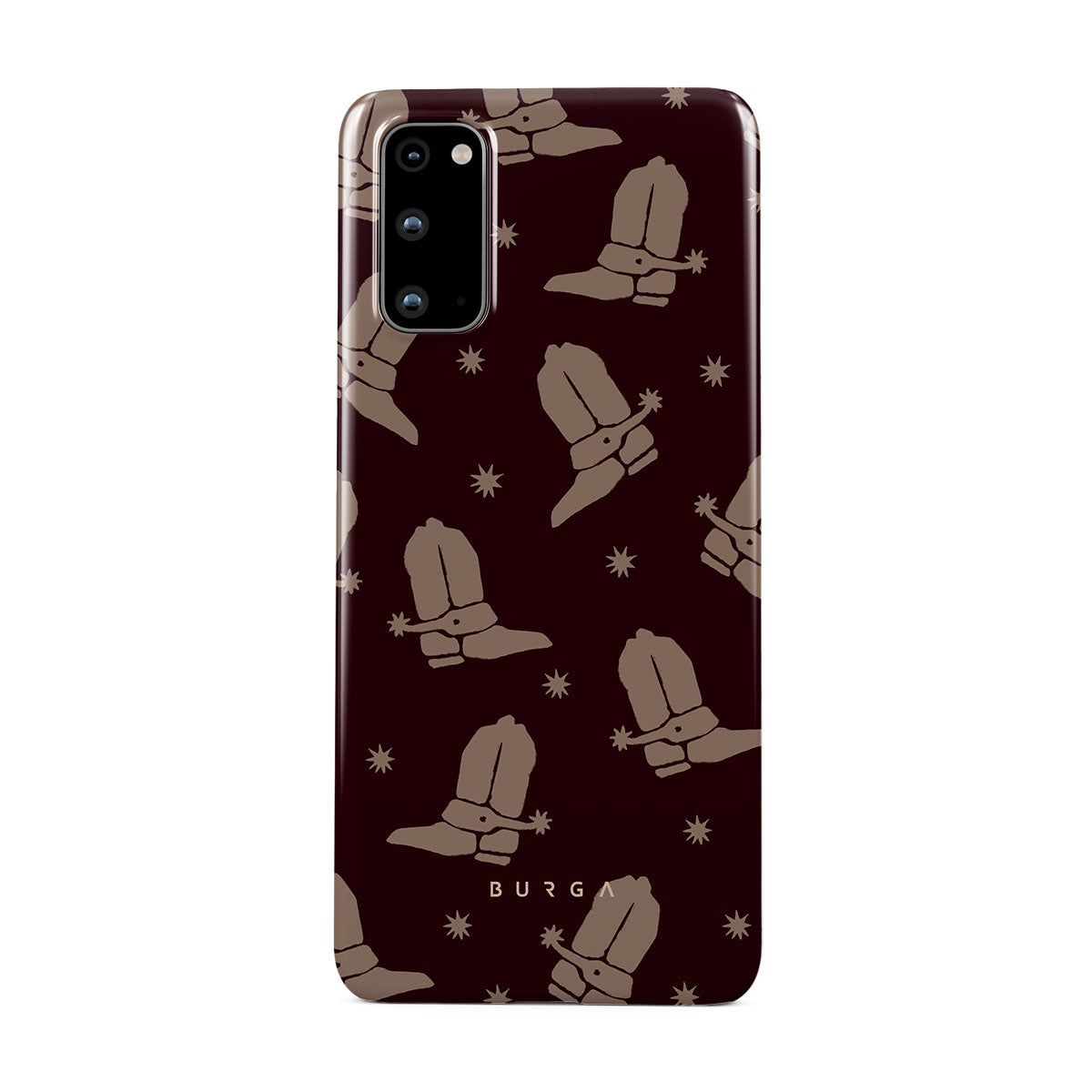 Say Howdy to this charming Samsung Galaxy S20 4G / 5G phone case design. Cowboy boots and stars dance across a deep brown background, celebrating the essence of western life. Perfect for those who embrace their free spirit.