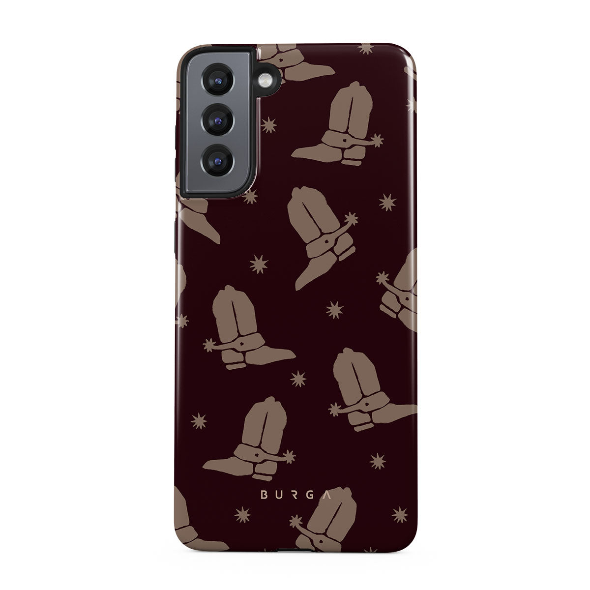 Say Howdy to this charming Samsung Galaxy S21 phone case design. Cowboy boots and stars dance across a deep brown background, celebrating the essence of western life. Perfect for those who embrace their free spirit.