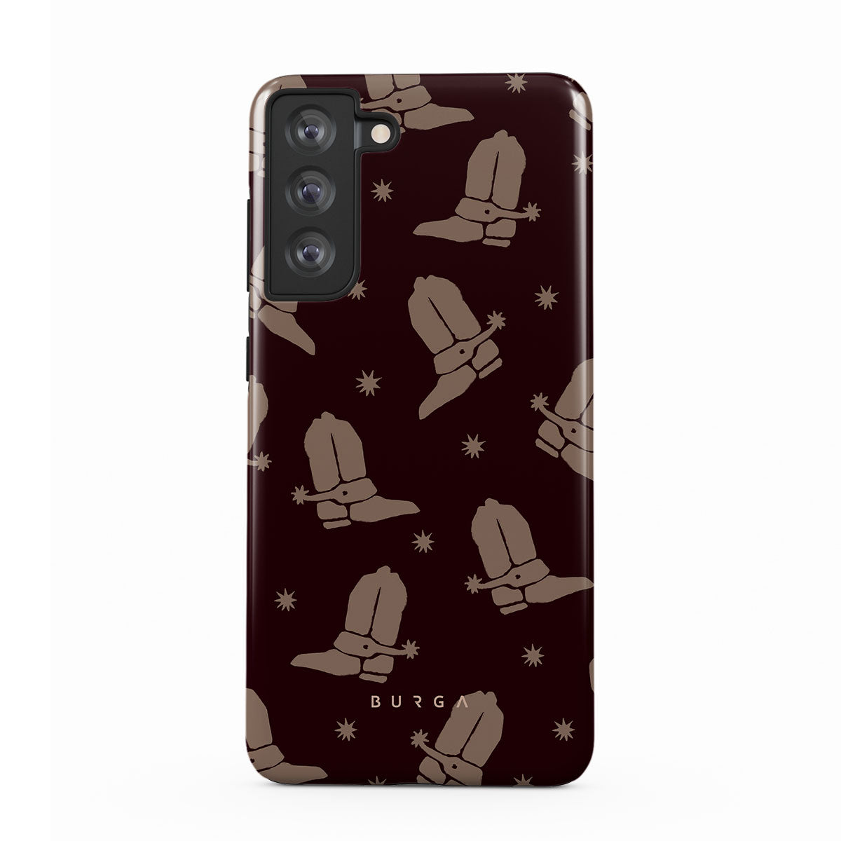 Say Howdy to this charming Samsung Galaxy S21 FE phone case design. Cowboy boots and stars dance across a deep brown background, celebrating the essence of western life. Perfect for those who embrace their free spirit.
