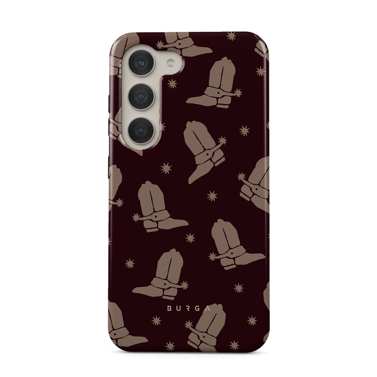 Say Howdy to this charming Samsung Galaxy S23 phone case design. Cowboy boots and stars dance across a deep brown background, celebrating the essence of western life. Perfect for those who embrace their free spirit.