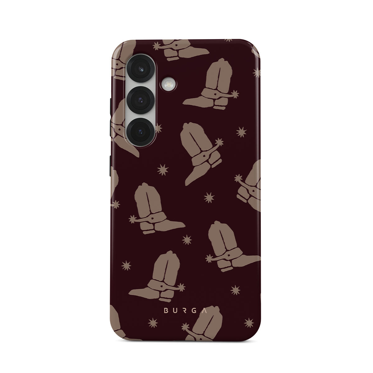 Say Howdy to this charming Samsung Galaxy S25 phone case design. Cowboy boots and stars dance across a deep brown background, celebrating the essence of western life. Perfect for those who embrace their free spirit.