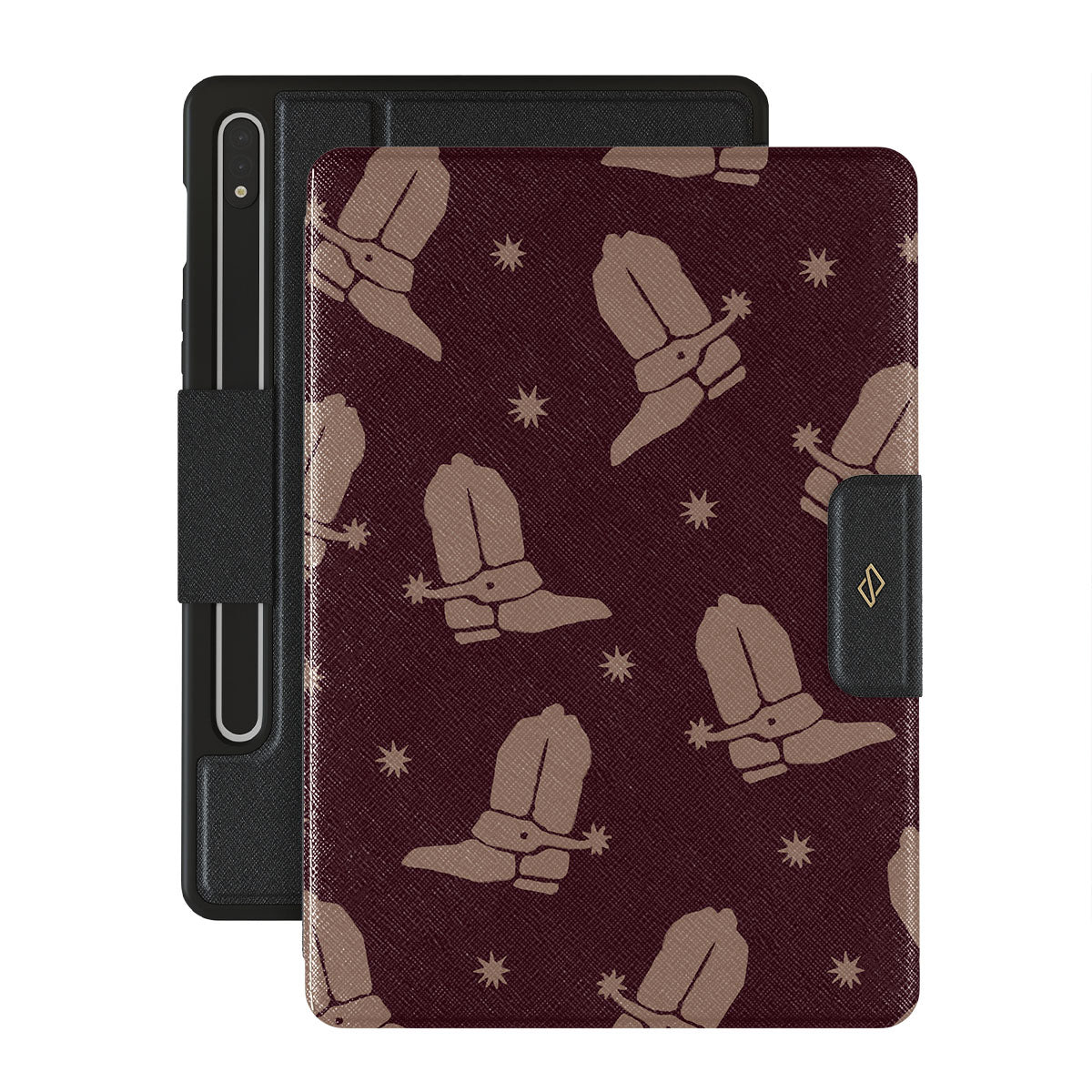 Say Howdy to this charming Samsung Galaxy Tab S10+ folio case design. Cowboy boots and stars dance across a deep brown background, celebrating the essence of western life. Perfect for those who embrace their free spirit.