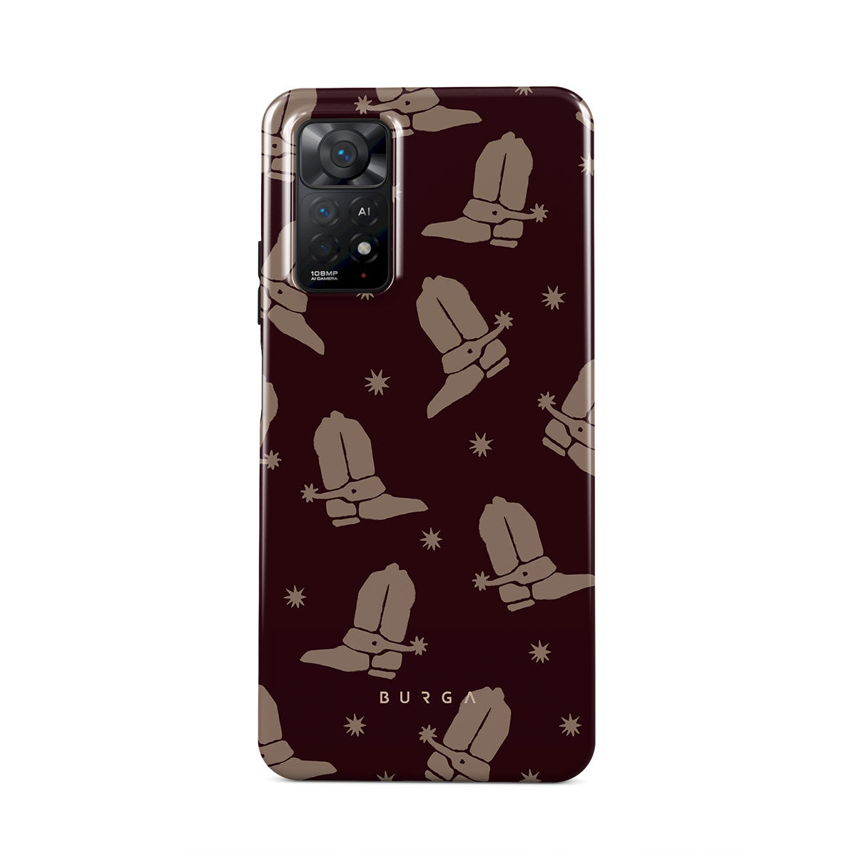 Say Howdy to this charming Xiaomi Redmi Note 11 Pro+ phone case design. Cowboy boots and stars dance across a deep brown background, celebrating the essence of western life. Perfect for those who embrace their free spirit.
