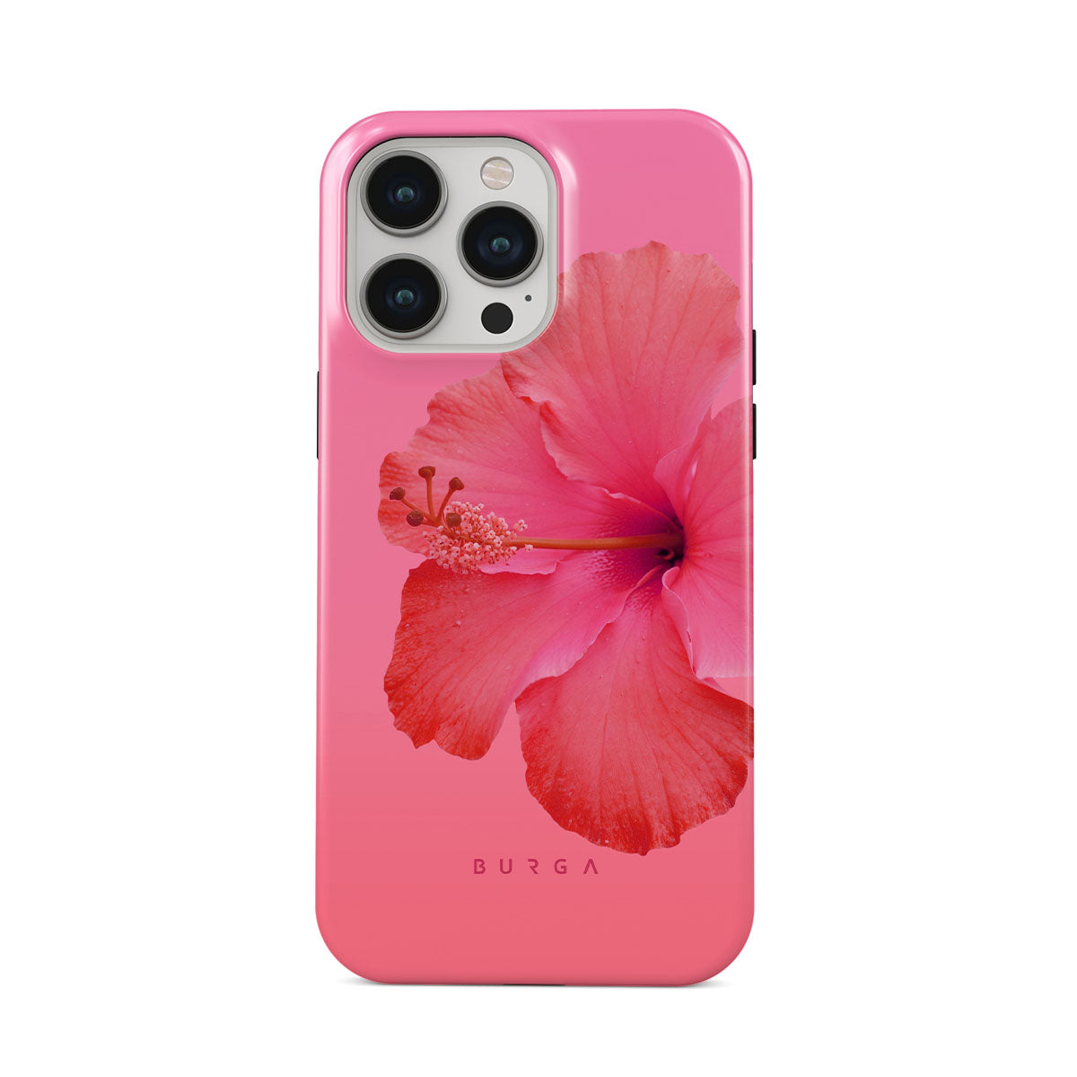 Our Island Girl iPhone 14 Pro phone case design bursts with the fiery red of a hibiscus in full bloom against a dreamy pink backdrop. Perfect for those who embody the spirit of a sun-kissed island retreat.