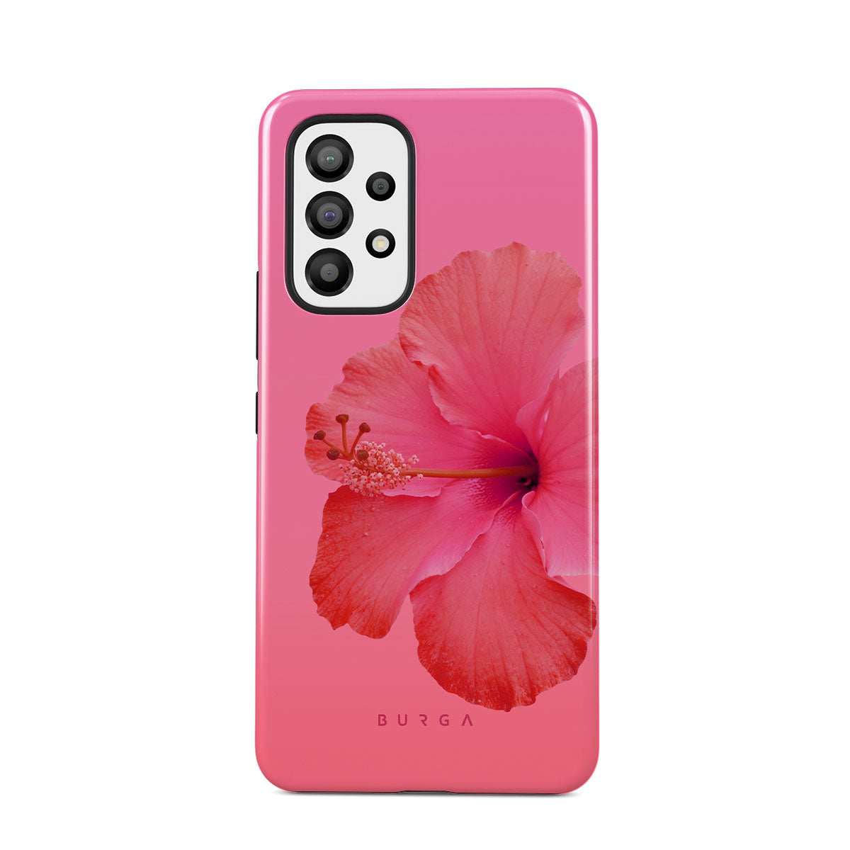Our Island Girl Samsung Galaxy A33 phone case design bursts with the fiery red of a hibiscus in full bloom against a dreamy pink backdrop. Perfect for those who embody the spirit of a sun-kissed island retreat.