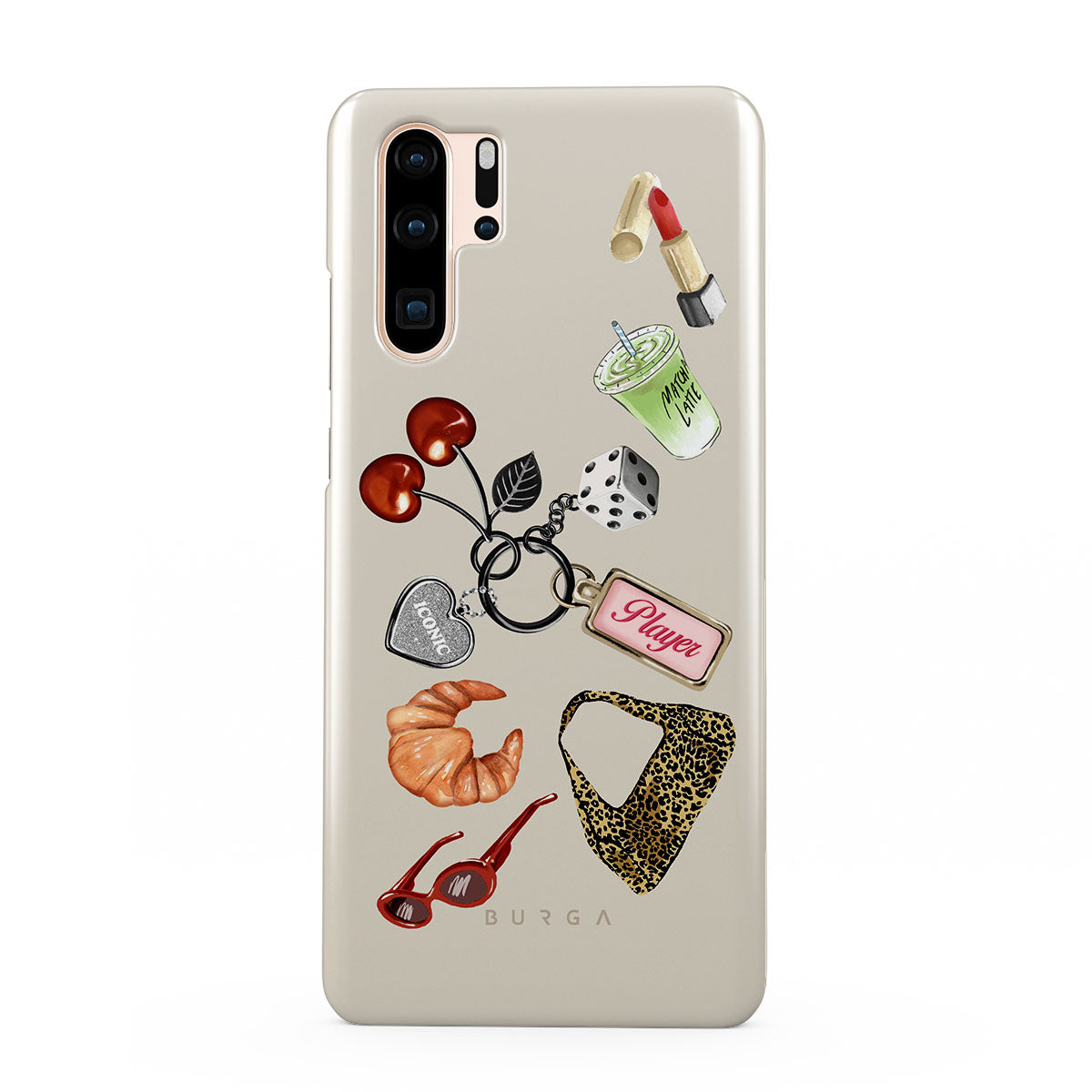 This design features: red sunglasses, red lipstick, green matcha drink, croissant, black dice, leopard-print bag, keychain with silver heart, cherries, dice and "Player" tag