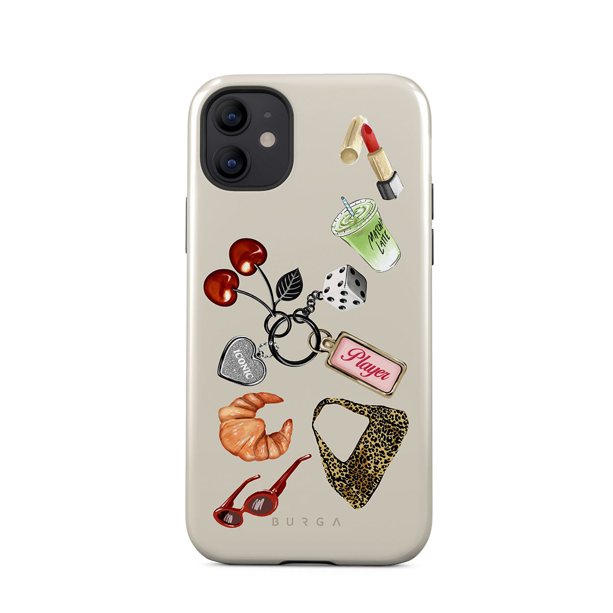 This design features: red sunglasses, red lipstick, green matcha drink, croissant, black dice, leopard-print bag, keychain with silver heart, cherries, dice and "Player" tag