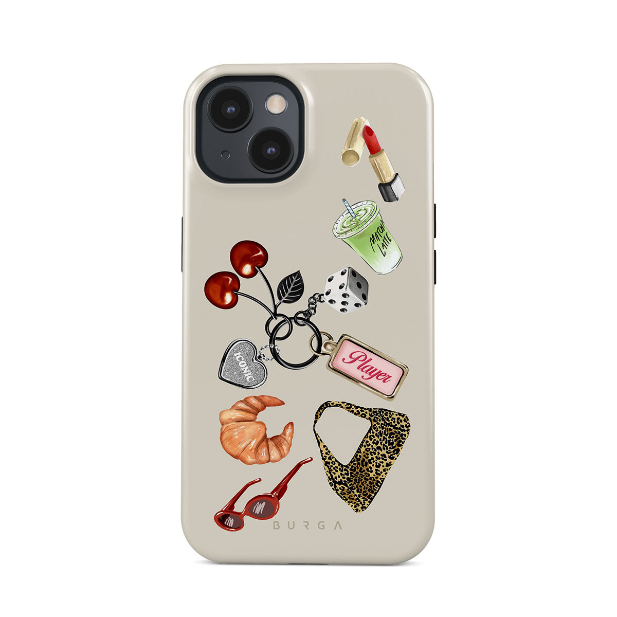 This design features: red sunglasses, red lipstick, green matcha drink, croissant, black dice, leopard-print bag, keychain with silver heart, cherries, dice and "Player" tag