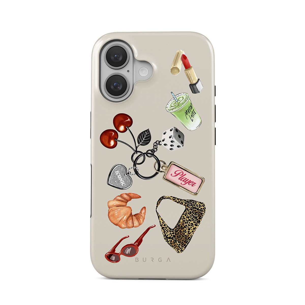 This design features: red sunglasses, red lipstick, green matcha drink, croissant, black dice, leopard-print bag, keychain with silver heart, cherries, dice and "Player" tag