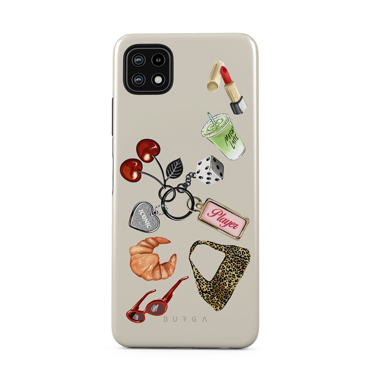 This design features: red sunglasses, red lipstick, green matcha drink, croissant, black dice, leopard-print bag, keychain with silver heart, cherries, dice and "Player" tag