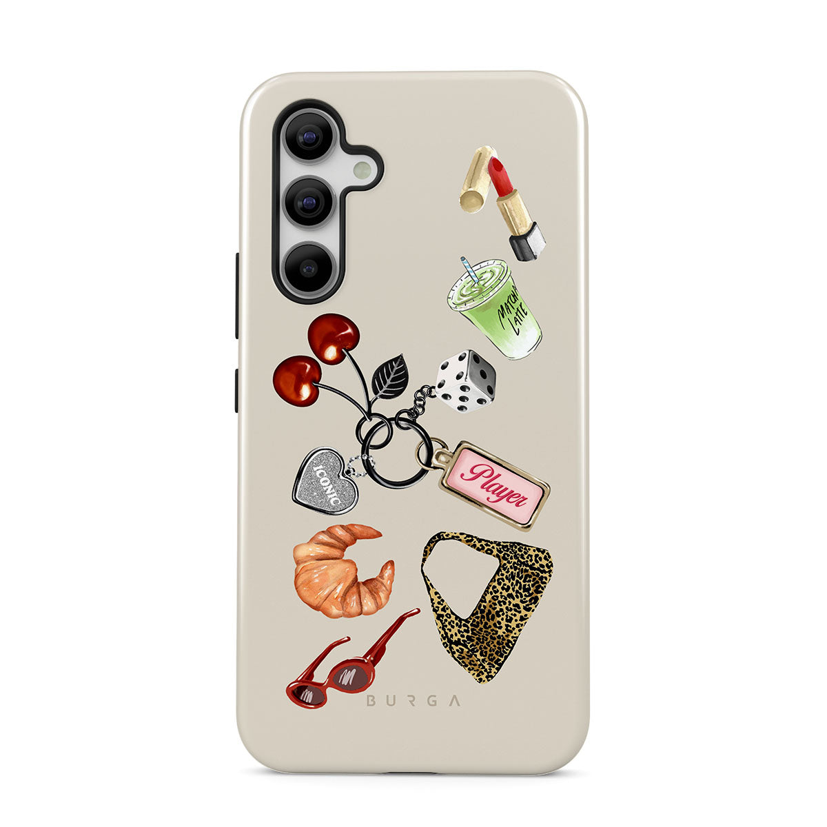 This design features: red sunglasses, red lipstick, green matcha drink, croissant, black dice, leopard-print bag, keychain with silver heart, cherries, dice and "Player" tag