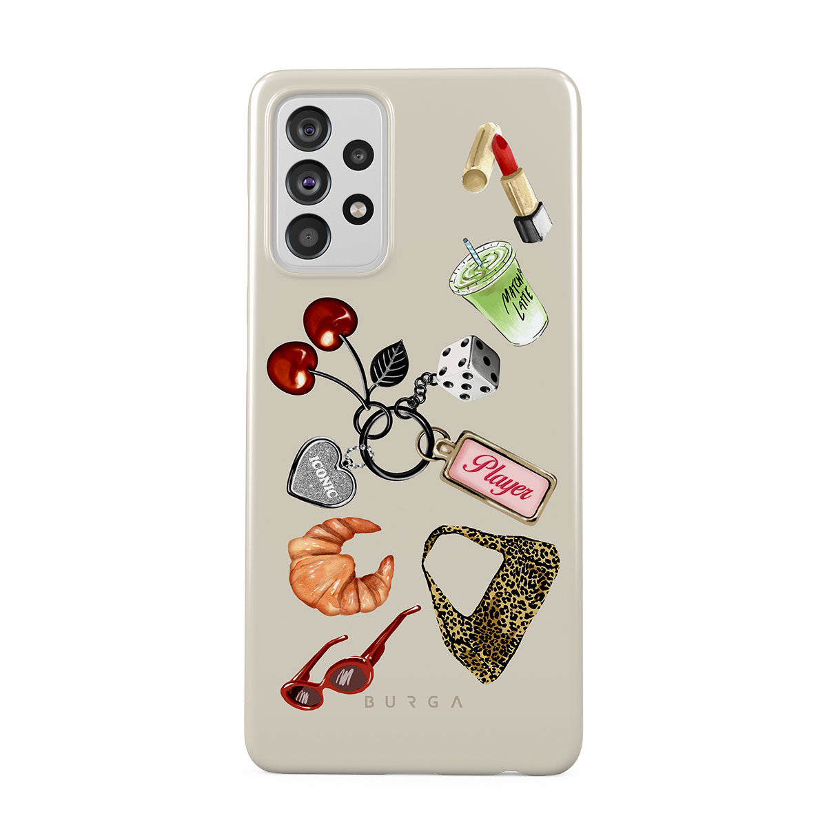 This design features: red sunglasses, red lipstick, green matcha drink, croissant, black dice, leopard-print bag, keychain with silver heart, cherries, dice and "Player" tag