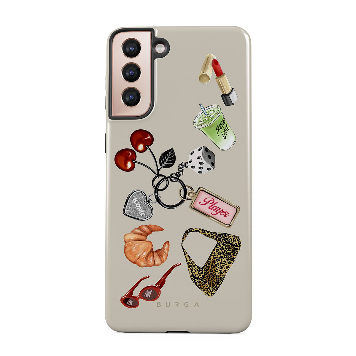 This design features: red sunglasses, red lipstick, green matcha drink, croissant, black dice, leopard-print bag, keychain with silver heart, cherries, dice and "Player" tag