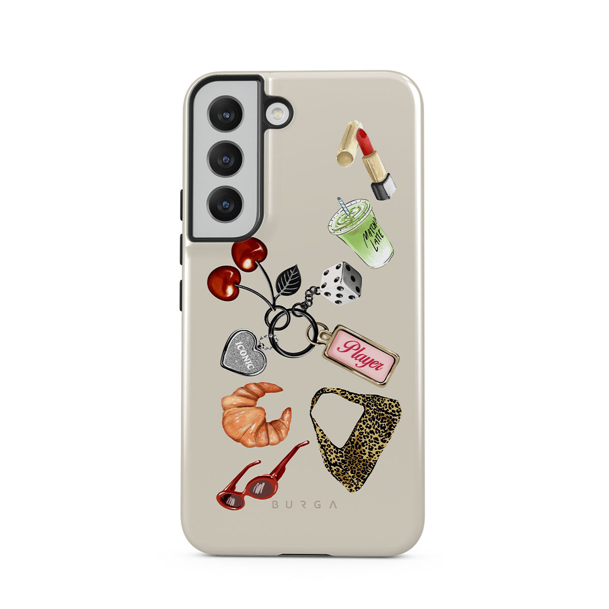 This design features: red sunglasses, red lipstick, green matcha drink, croissant, black dice, leopard-print bag, keychain with silver heart, cherries, dice and "Player" tag