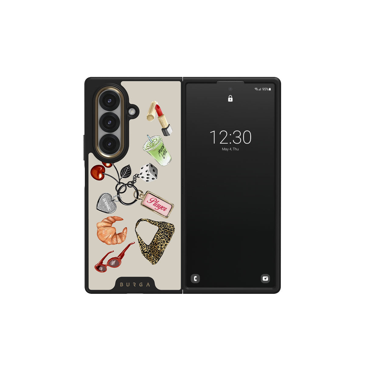 This design features: red sunglasses, red lipstick, green matcha drink, croissant, black dice, leopard-print bag, keychain with silver heart, cherries, dice and "Player" tag