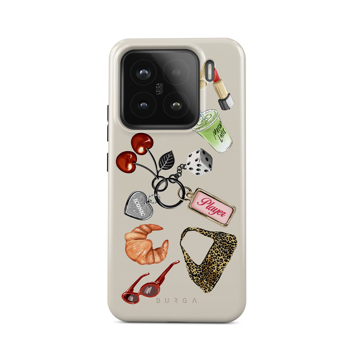 This design features: red sunglasses, red lipstick, green matcha drink, croissant, black dice, leopard-print bag, keychain with silver heart, cherries, dice and "Player" tag