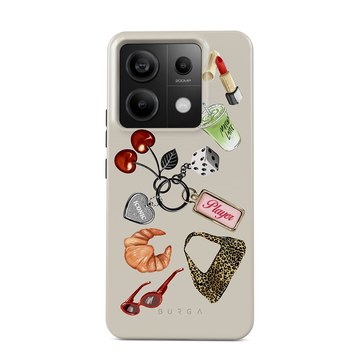 This design features: red sunglasses, red lipstick, green matcha drink, croissant, black dice, leopard-print bag, keychain with silver heart, cherries, dice and "Player" tag