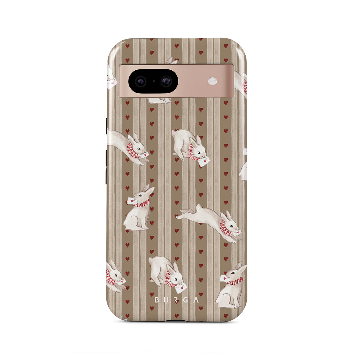 The Late Again Google Pixel 8a phone case design is a love letter lost in time—scattered hearts, hurried notes, and white rabbits racing against a clock that refuses to be tamed. Sent, but never received. Read, but never answered. Always running, always chasing, always just a moment too late.