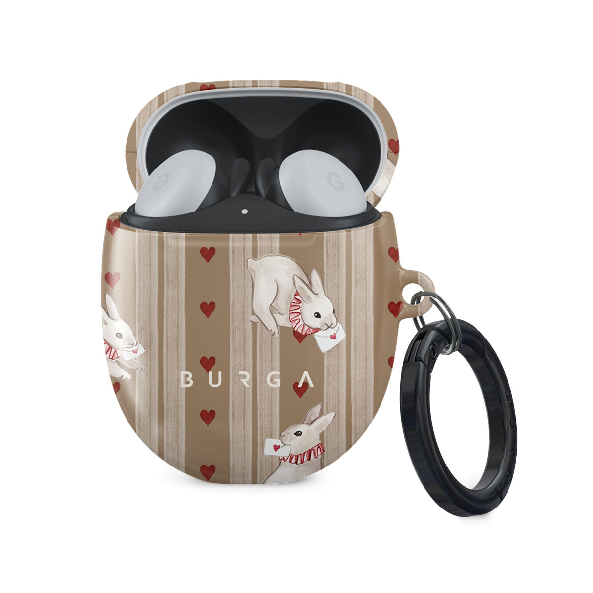 The Late Again Google Pixel Buds 2 case cover design is a love letter lost in time—scattered hearts, hurried notes, and white rabbits racing against a clock that refuses to be tamed. Sent, but never received. Read, but never answered. Always running, always chasing, always just a moment too late.