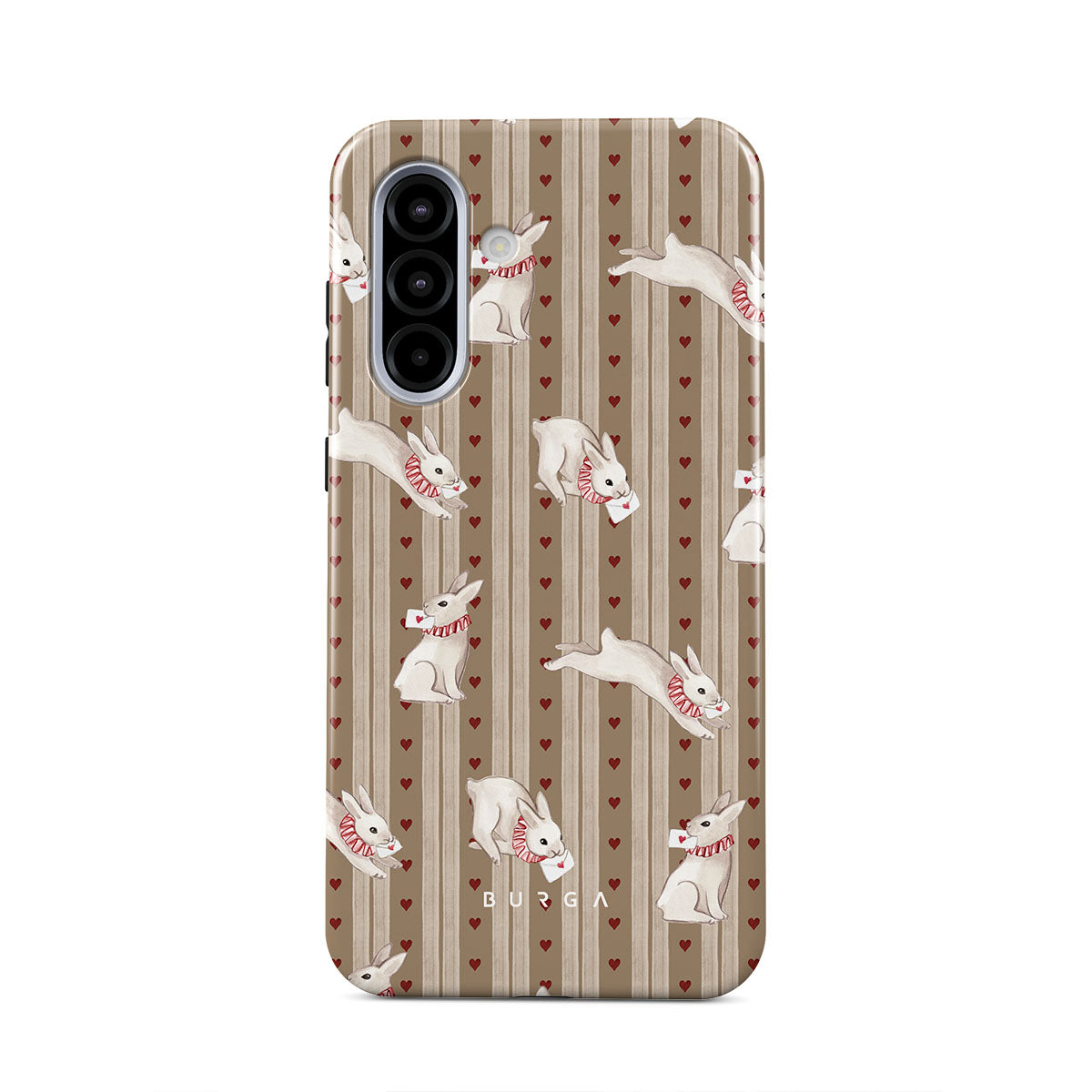 The Late Again Samsung Galaxy A36 5G phone case design is a love letter lost in time—scattered hearts, hurried notes, and white rabbits racing against a clock that refuses to be tamed. Sent, but never received. Read, but never answered. Always running, always chasing, always just a moment too late.