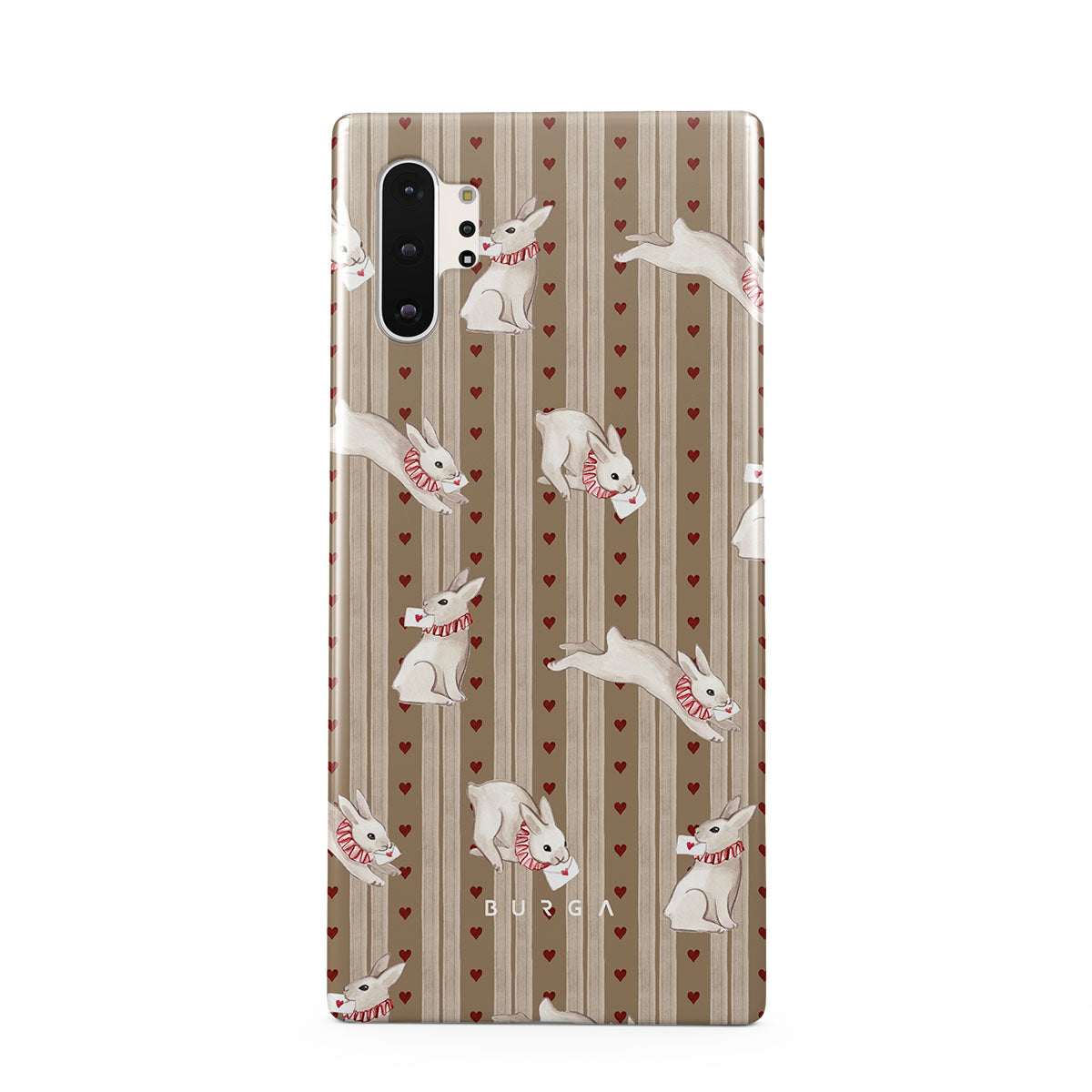 The Late Again Samsung Galaxy Note 10 Plus phone case design is a love letter lost in time—scattered hearts, hurried notes, and white rabbits racing against a clock that refuses to be tamed. Sent, but never received. Read, but never answered. Always running, always chasing, always just a moment too late.