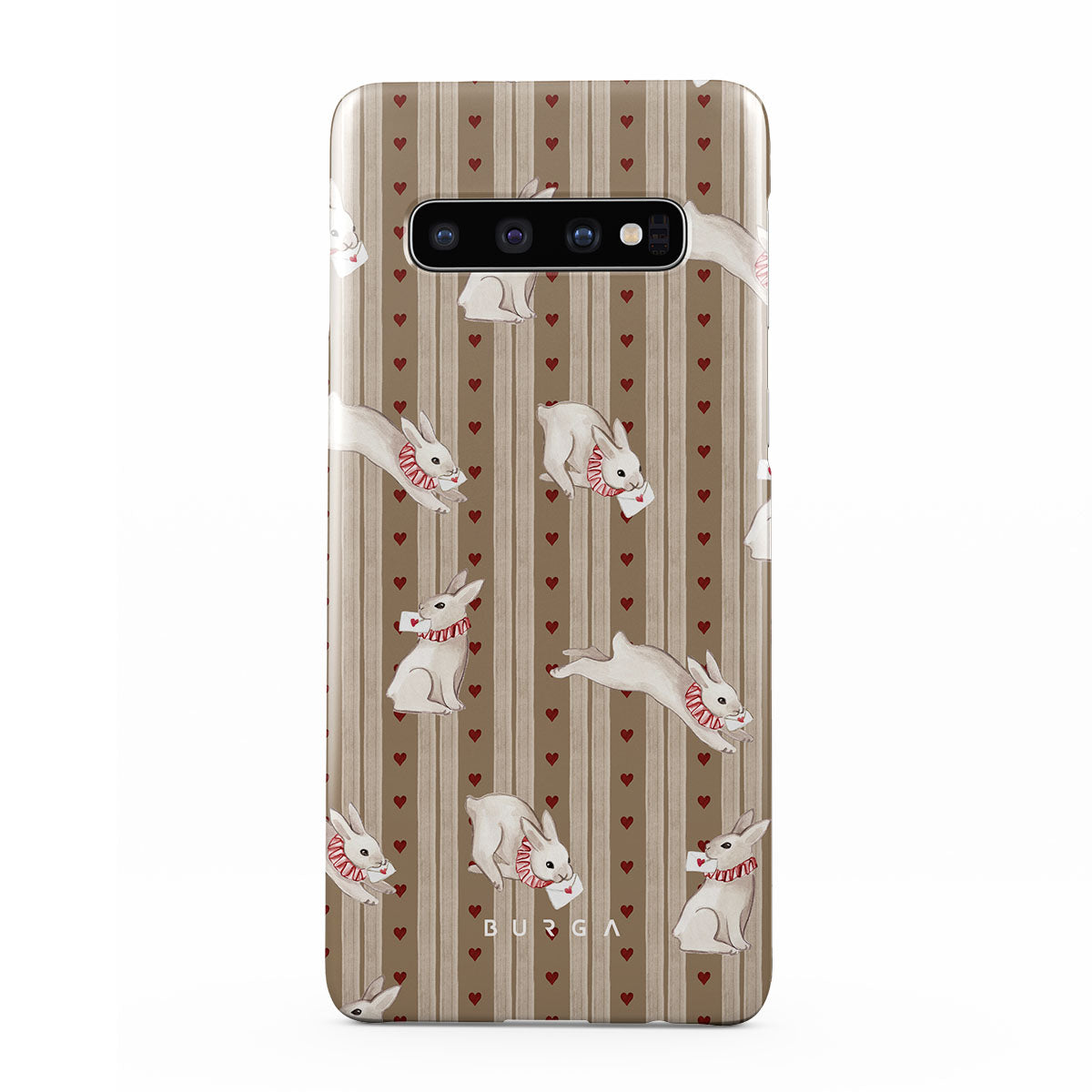 The Late Again Samsung Galaxy S10 Plus phone case design is a love letter lost in time—scattered hearts, hurried notes, and white rabbits racing against a clock that refuses to be tamed. Sent, but never received. Read, but never answered. Always running, always chasing, always just a moment too late.