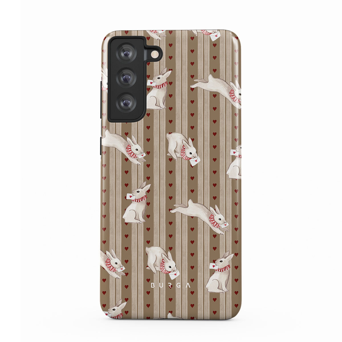 The Late Again Samsung Galaxy S21 FE phone case design is a love letter lost in time—scattered hearts, hurried notes, and white rabbits racing against a clock that refuses to be tamed. Sent, but never received. Read, but never answered. Always running, always chasing, always just a moment too late.