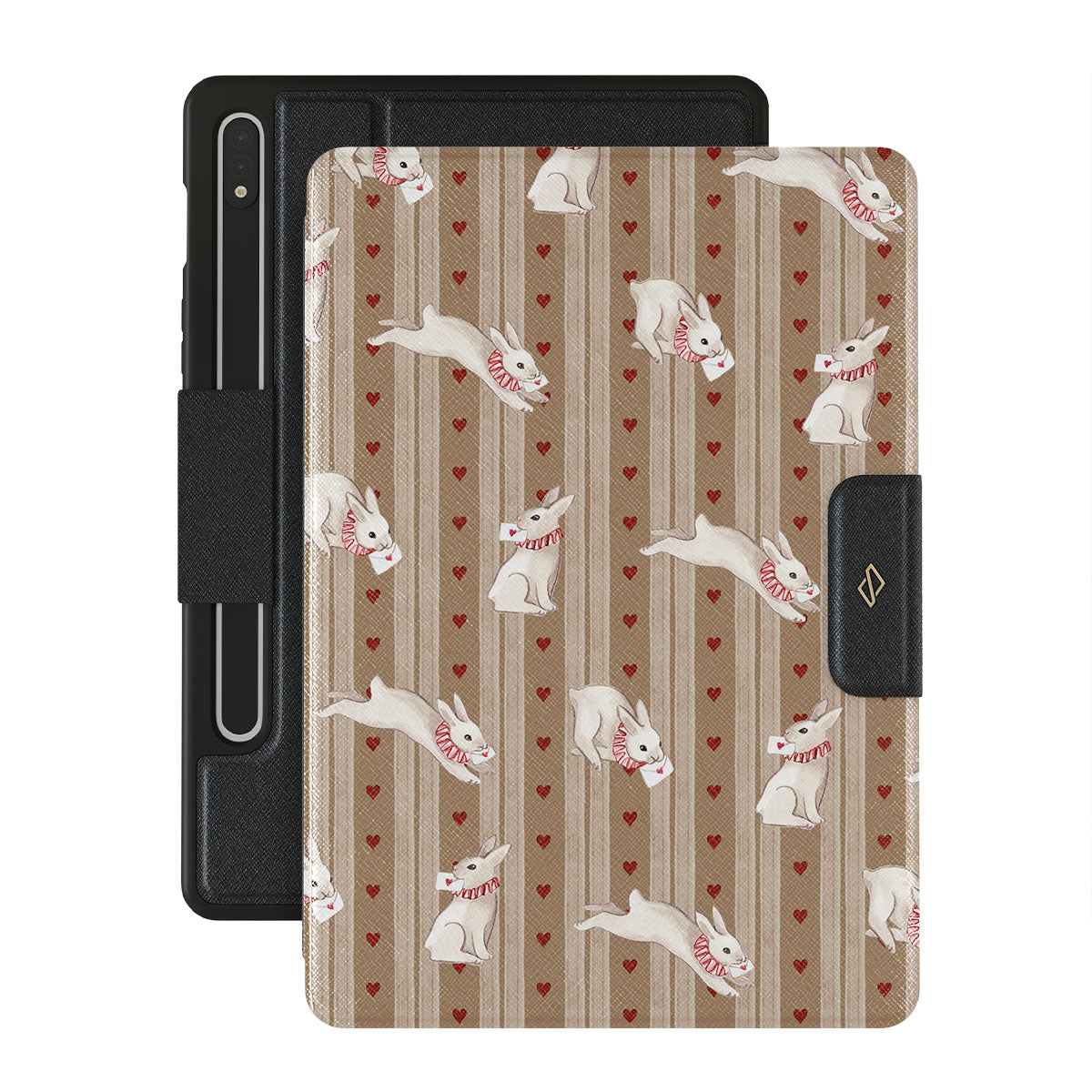 The Late Again Samsung Galaxy Tab S10+ folio case design is a love letter lost in time—scattered hearts, hurried notes, and white rabbits racing against a clock that refuses to be tamed. Sent, but never received. Read, but never answered. Always running, always chasing, always just a moment too late.