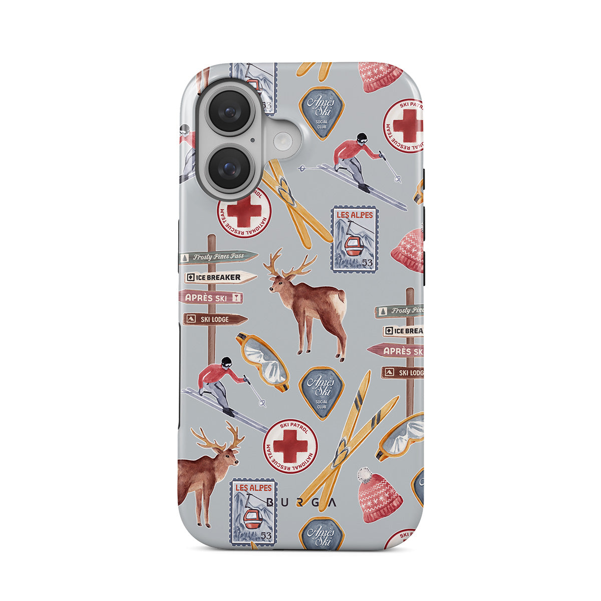 A vintage ski poster straight from your dad's college dorm. A iPhone 16 Plus phone case design dripping with nostalgia.