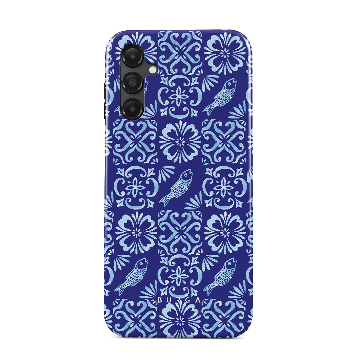 This design features: Portuguese tile patterns, deep blues, floral patterns, flowers, fish