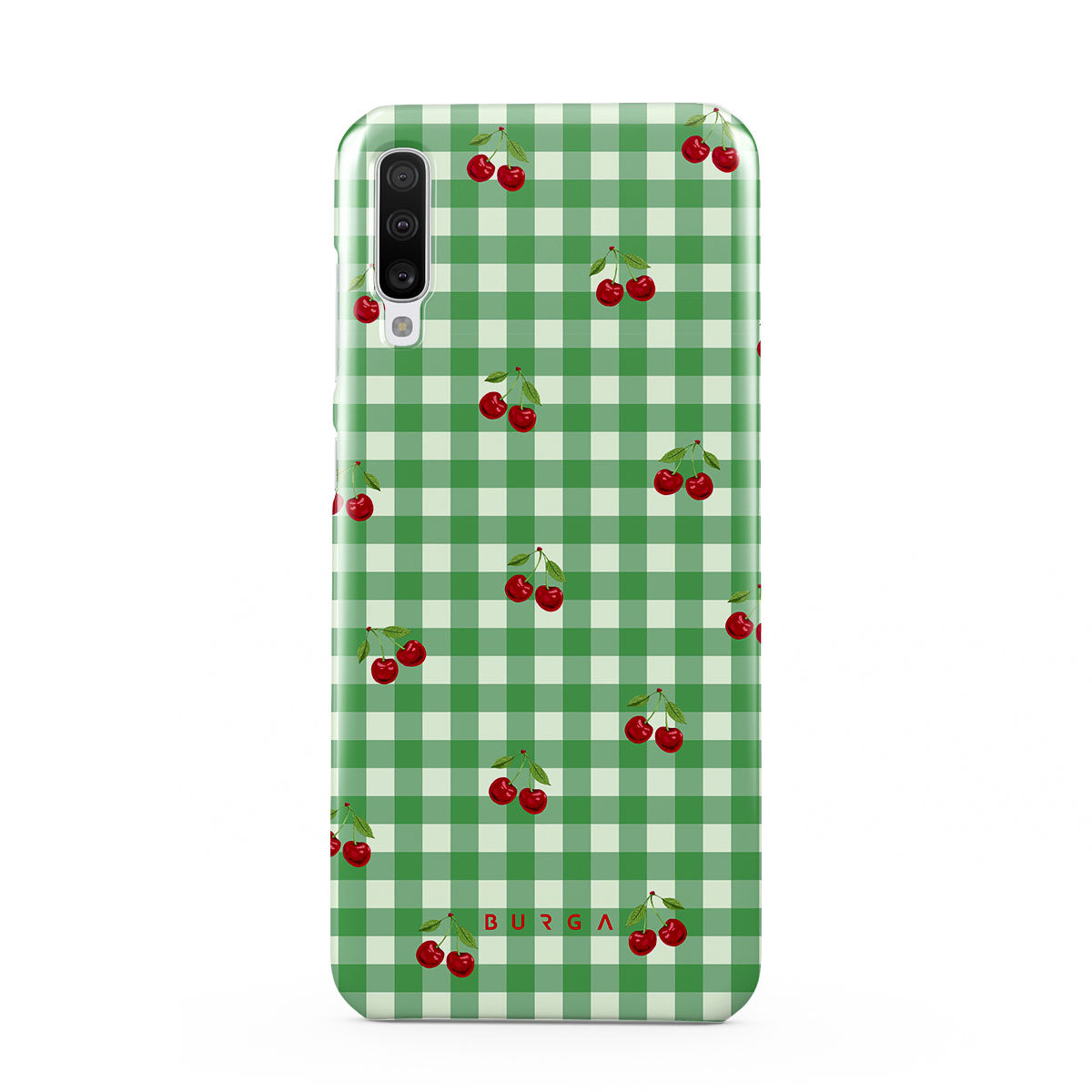 The Little Life Samsung Galaxy A70 phone case design: green checks, simple and true, like a patch of grass under a tree, where you can sit and watch the small world go by, every leaf a chapter in nature’s story.