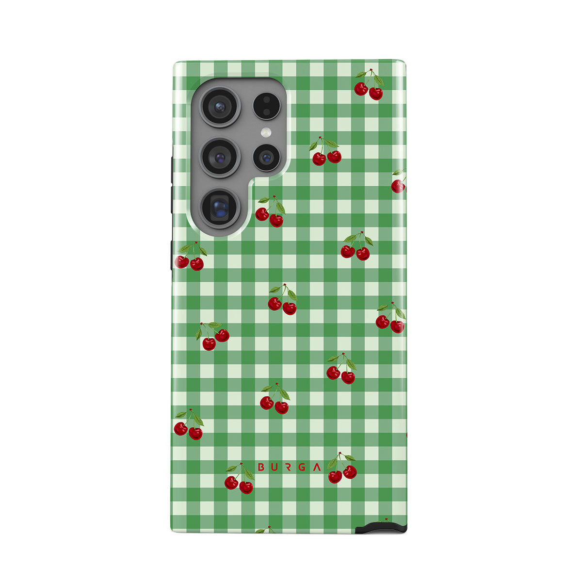 The Little Life Samsung Galaxy S24 Ultra phone case design: green checks, simple and true, like a patch of grass under a tree, where you can sit and watch the small world go by, every leaf a chapter in nature’s story.