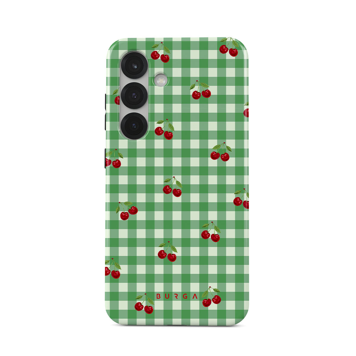 The Little Life Samsung Galaxy S25 Plus phone case design: green checks, simple and true, like a patch of grass under a tree, where you can sit and watch the small world go by, every leaf a chapter in nature’s story.