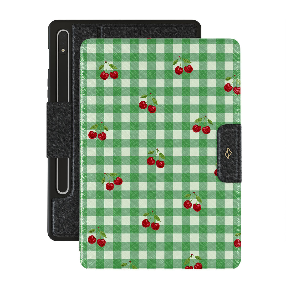 The Little Life Samsung Galaxy Tab S10+ folio case design: green checks, simple and true, like a patch of grass under a tree, where you can sit and watch the small world go by, every leaf a chapter in nature’s story.