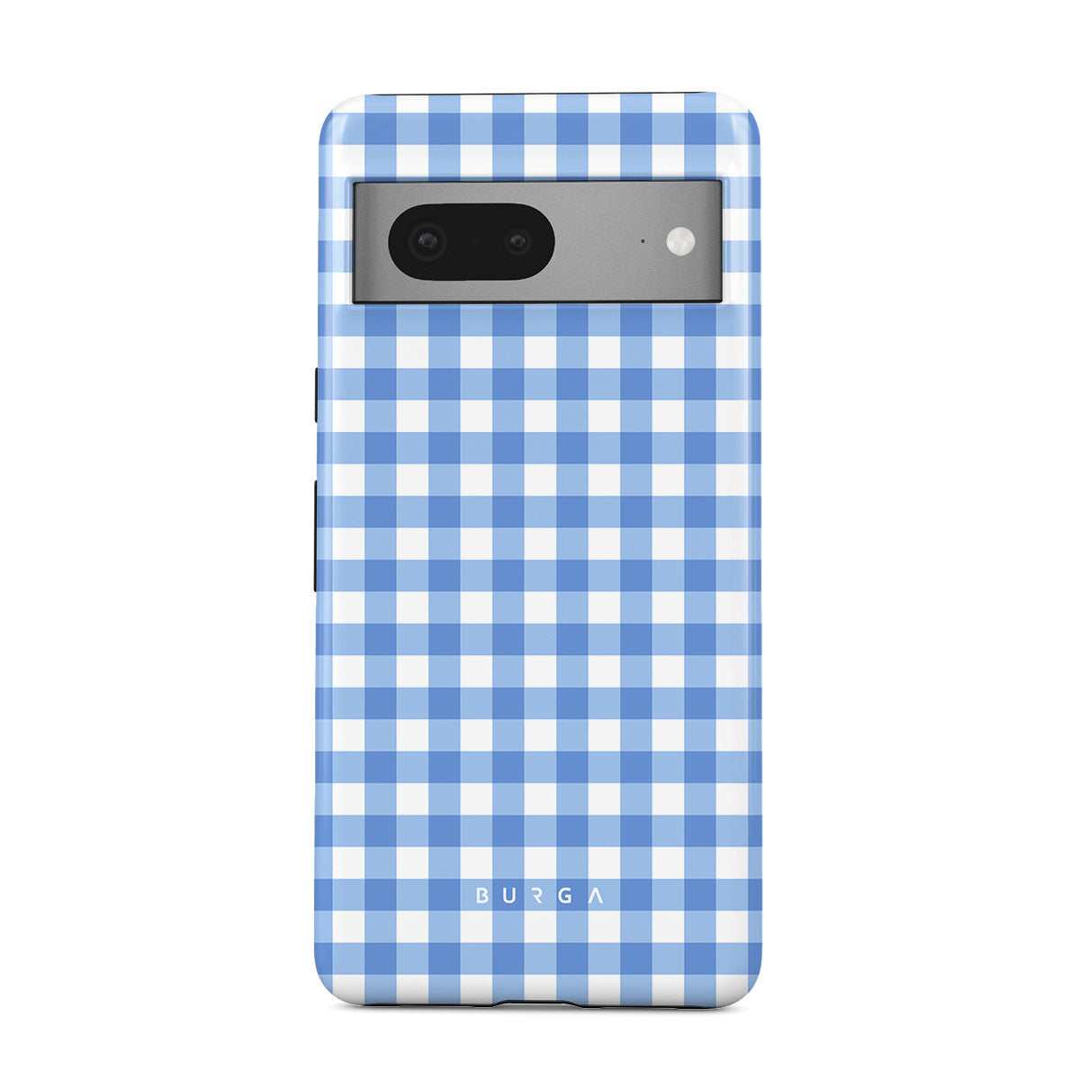 Crisp blue checks are your invitation to lay on the grass, look up at the sky, and find shapes in the clouds—simple joys that make any day lovely. That’s our Lovely Day Google Pixel 7a phone case design.