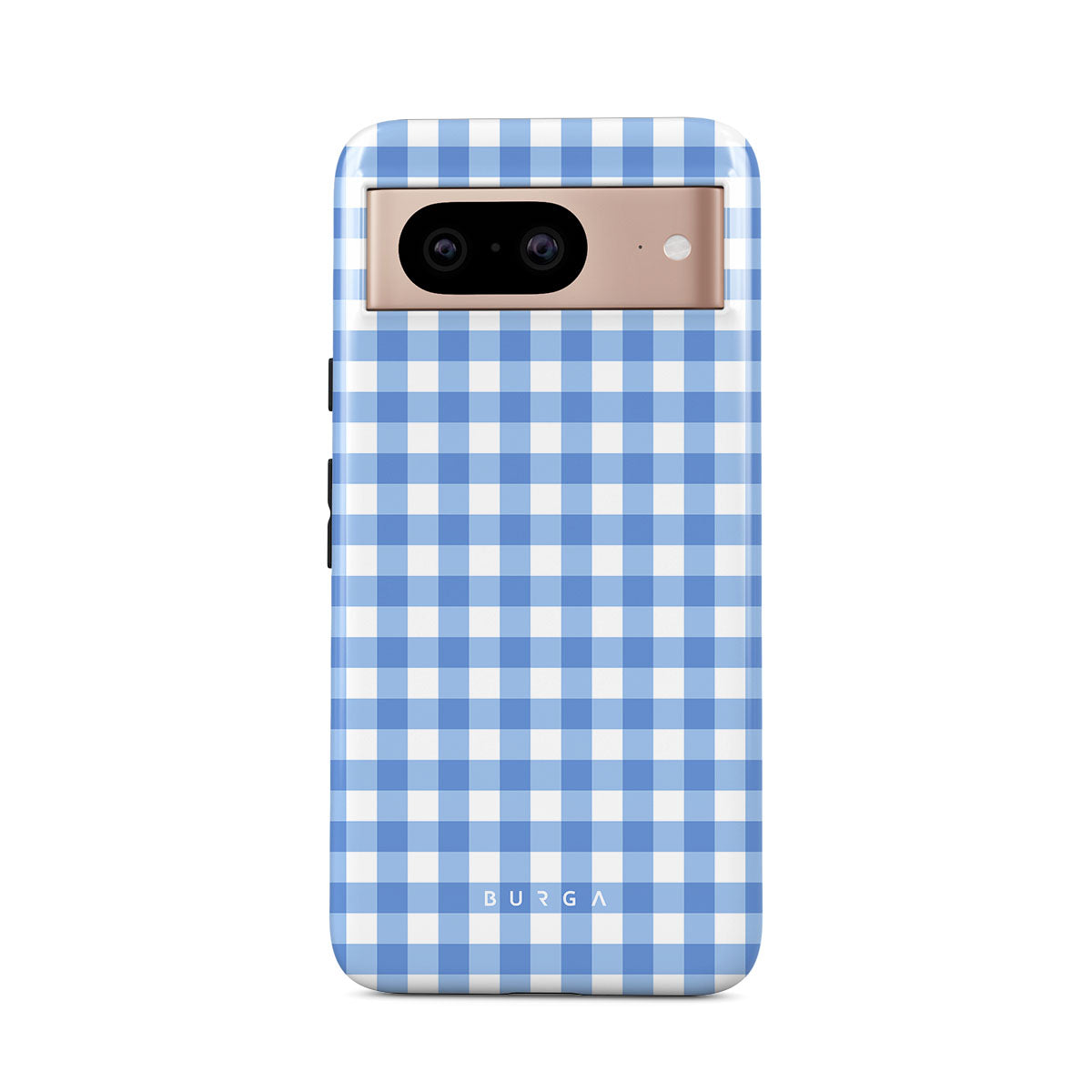 Crisp blue checks are your invitation to lay on the grass, look up at the sky, and find shapes in the clouds—simple joys that make any day lovely. That’s our Lovely Day Google Pixel 8 phone case design.