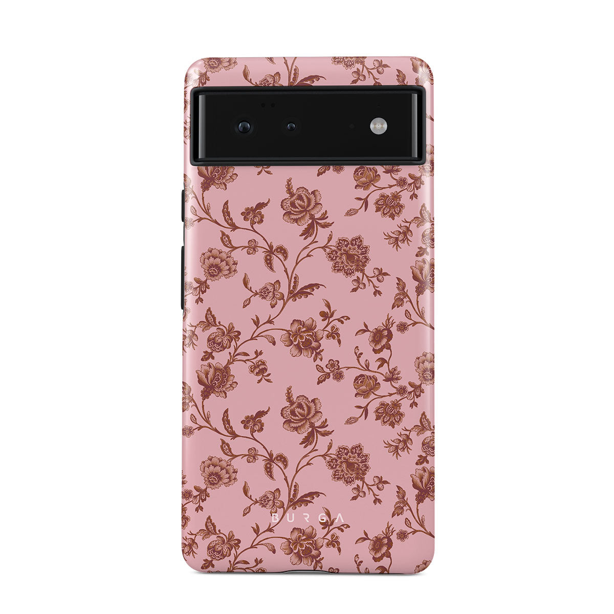 The Lover Google Pixel 6a phone case design: because you're a Lover, not a fighter. Delicate floral motifs across a soft pink background capture the essence of timeless beauty and rustic elegance. Perfect for modern-day cowgirls with a vintage heart.