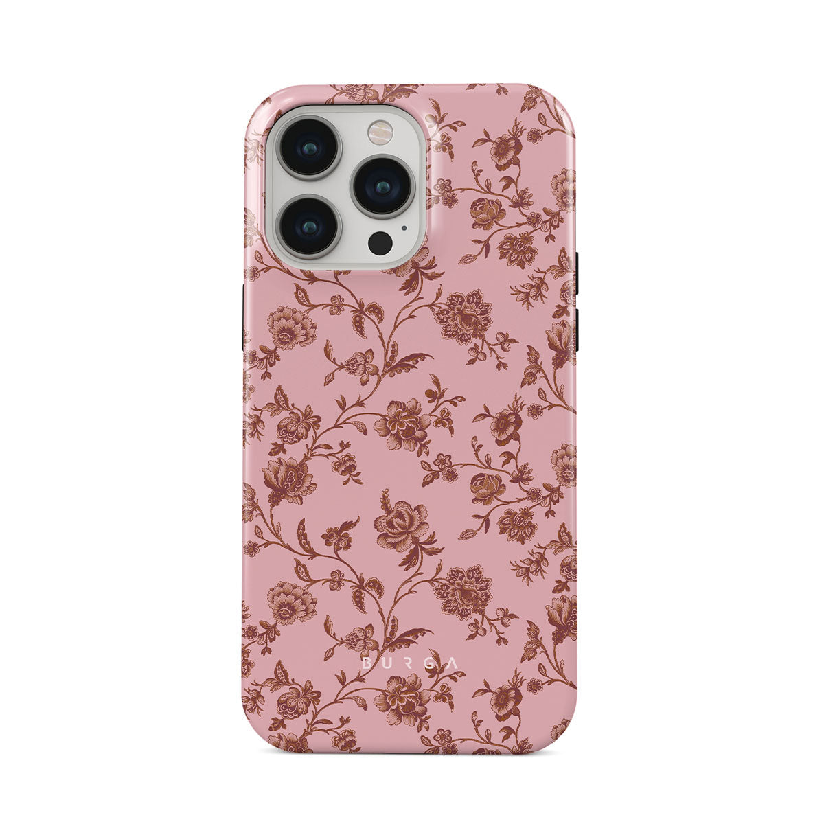 The Lover iPhone 13 Pro Max phone case design: because you're a Lover, not a fighter. Delicate floral motifs across a soft pink background capture the essence of timeless beauty and rustic elegance. Perfect for modern-day cowgirls with a vintage heart.