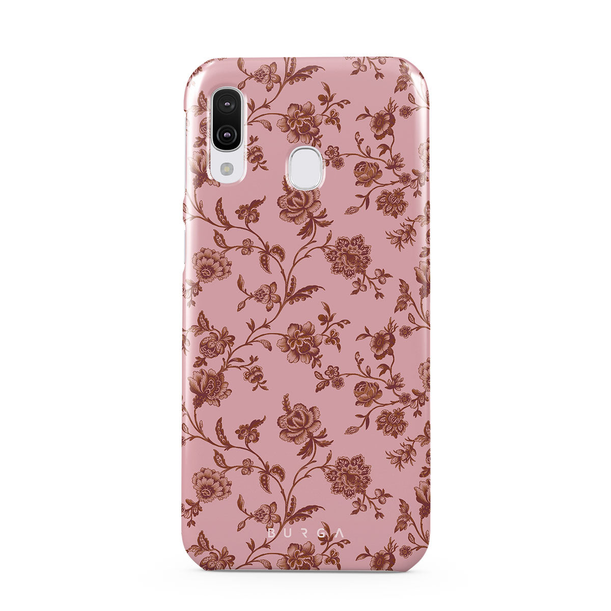 The Lover Samsung Galaxy A40 phone case design: because you're a Lover, not a fighter. Delicate floral motifs across a soft pink background capture the essence of timeless beauty and rustic elegance. Perfect for modern-day cowgirls with a vintage heart.