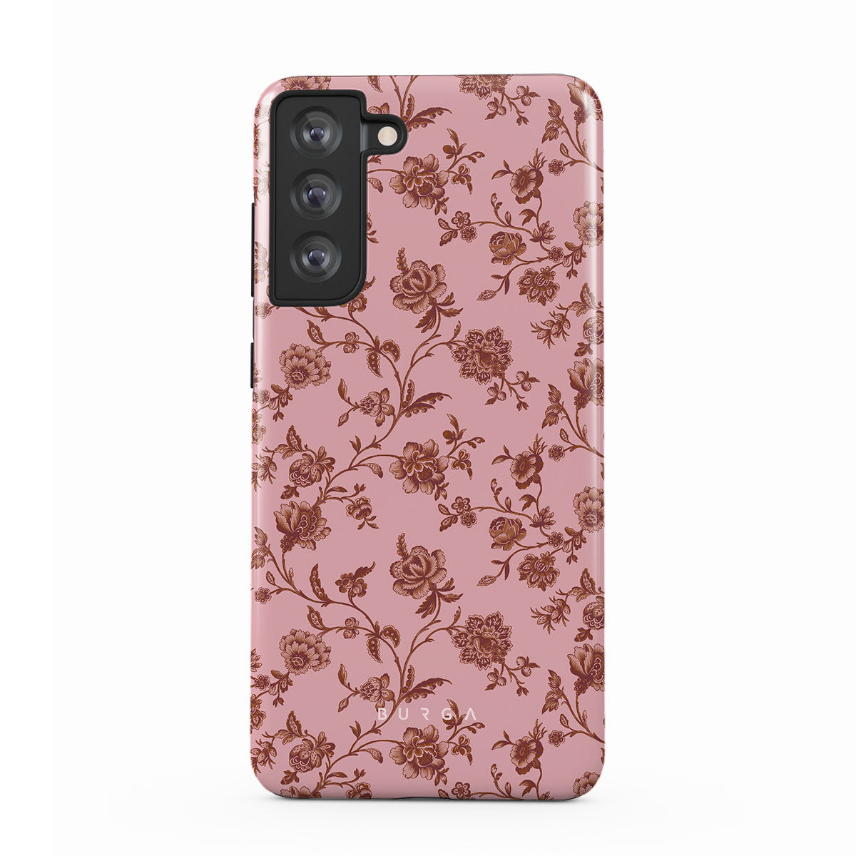The Lover Samsung Galaxy S21 FE phone case design: because you're a Lover, not a fighter. Delicate floral motifs across a soft pink background capture the essence of timeless beauty and rustic elegance. Perfect for modern-day cowgirls with a vintage heart.