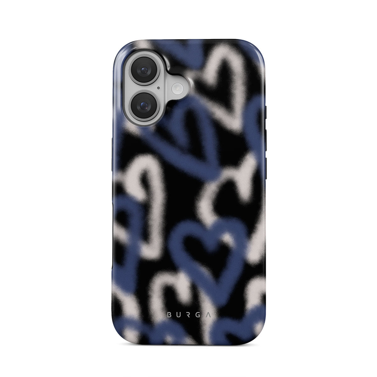 The Lucky You iPhone 16 phone case captures the raw, unfiltered pulse of street art. Graffiti hearts in striking blue and white stand out against a black background, their edges softly faded. It’s a design that speaks to the restless who find beauty in chaos and dare to be different.