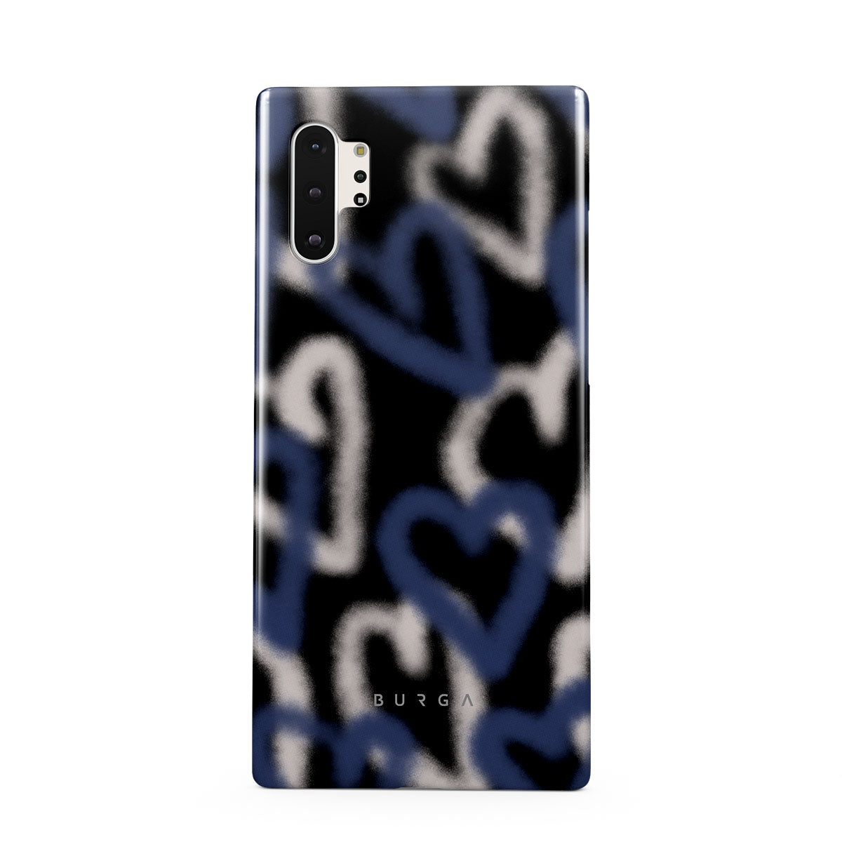 The Lucky You Samsung Galaxy Note 10 Plus phone case captures the raw, unfiltered pulse of street art. Graffiti hearts in striking blue and white stand out against a black background, their edges softly faded. It’s a design that speaks to the restless who find beauty in chaos and dare to be different.